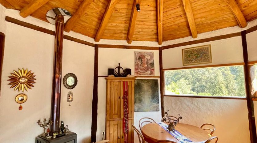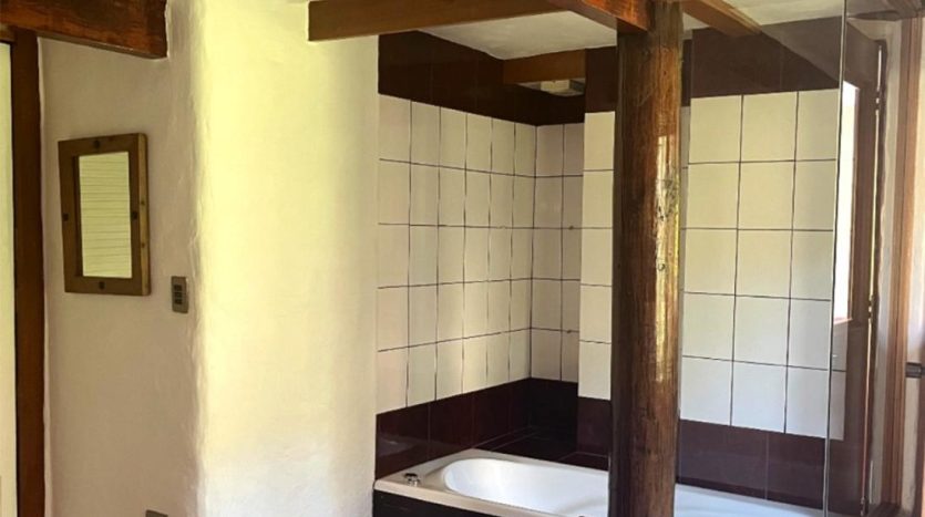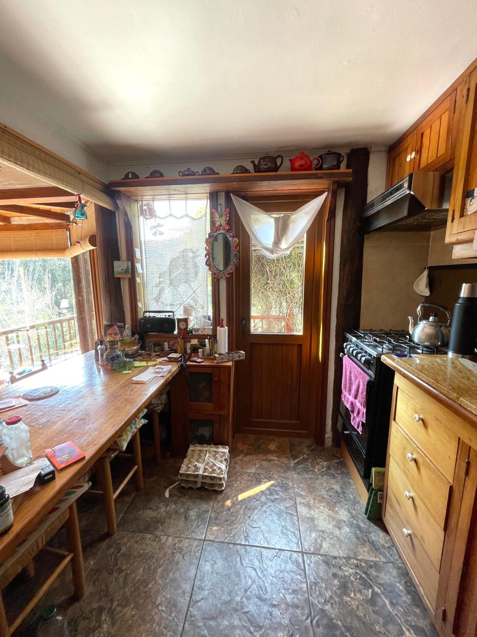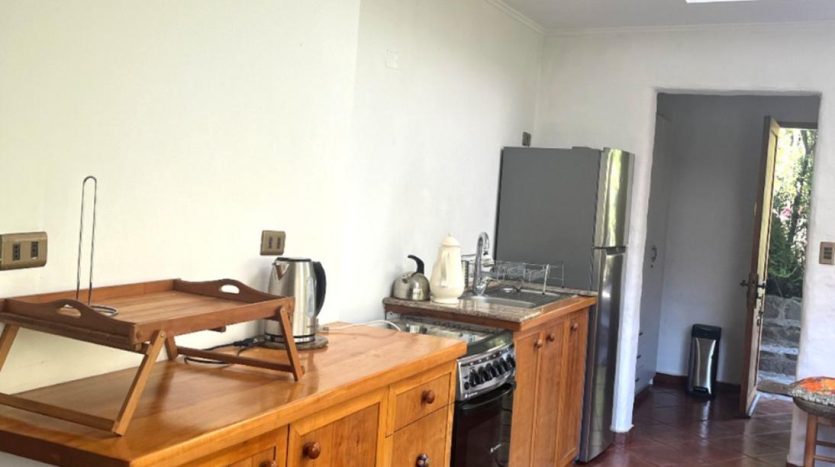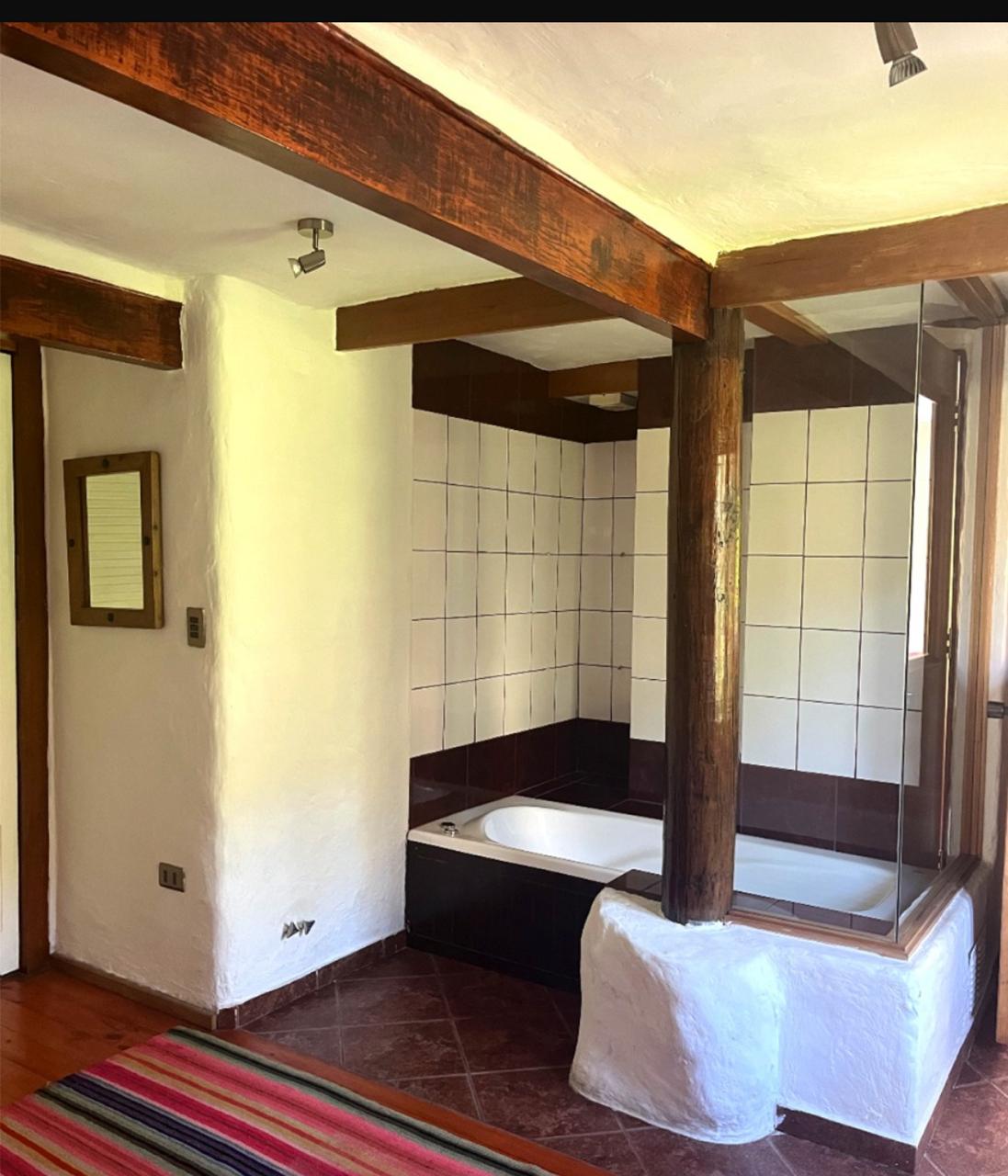 En el exterior hay piscina con bomba de calor al borde del río, accesible mediante escaleras y senderos de piedra. La casa cuenta con calefacción por estufas, estacionamiento para aproximadamente cuatro autos y gastos comunes de 20000 CLP.