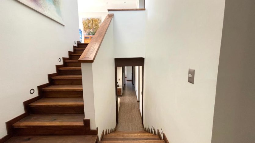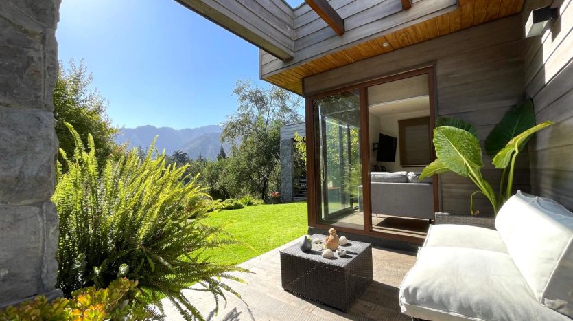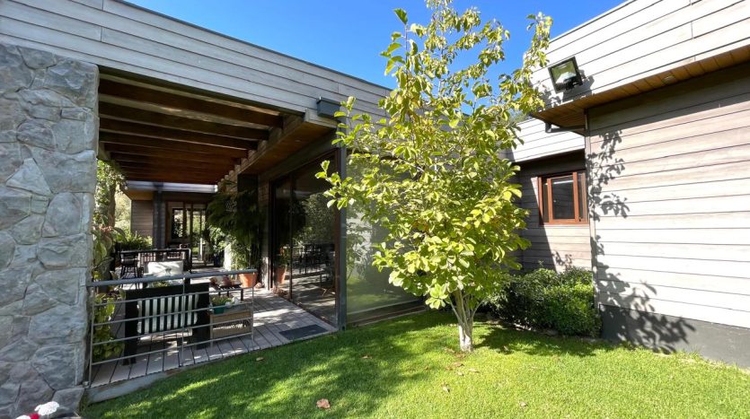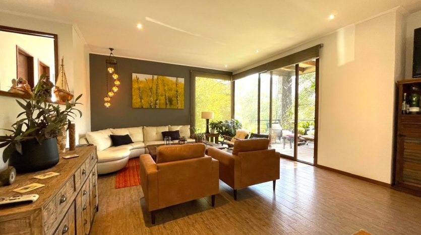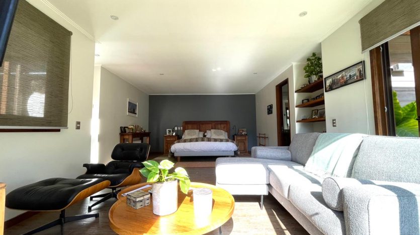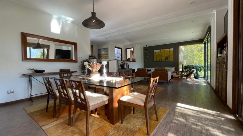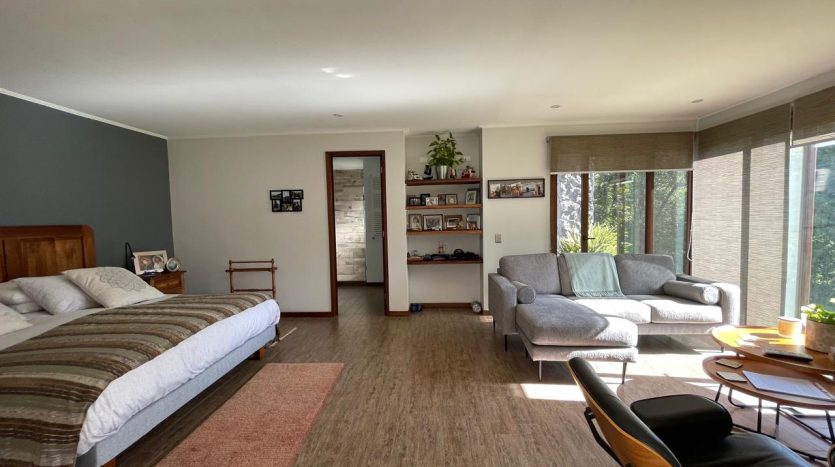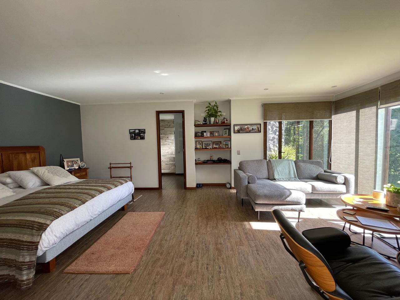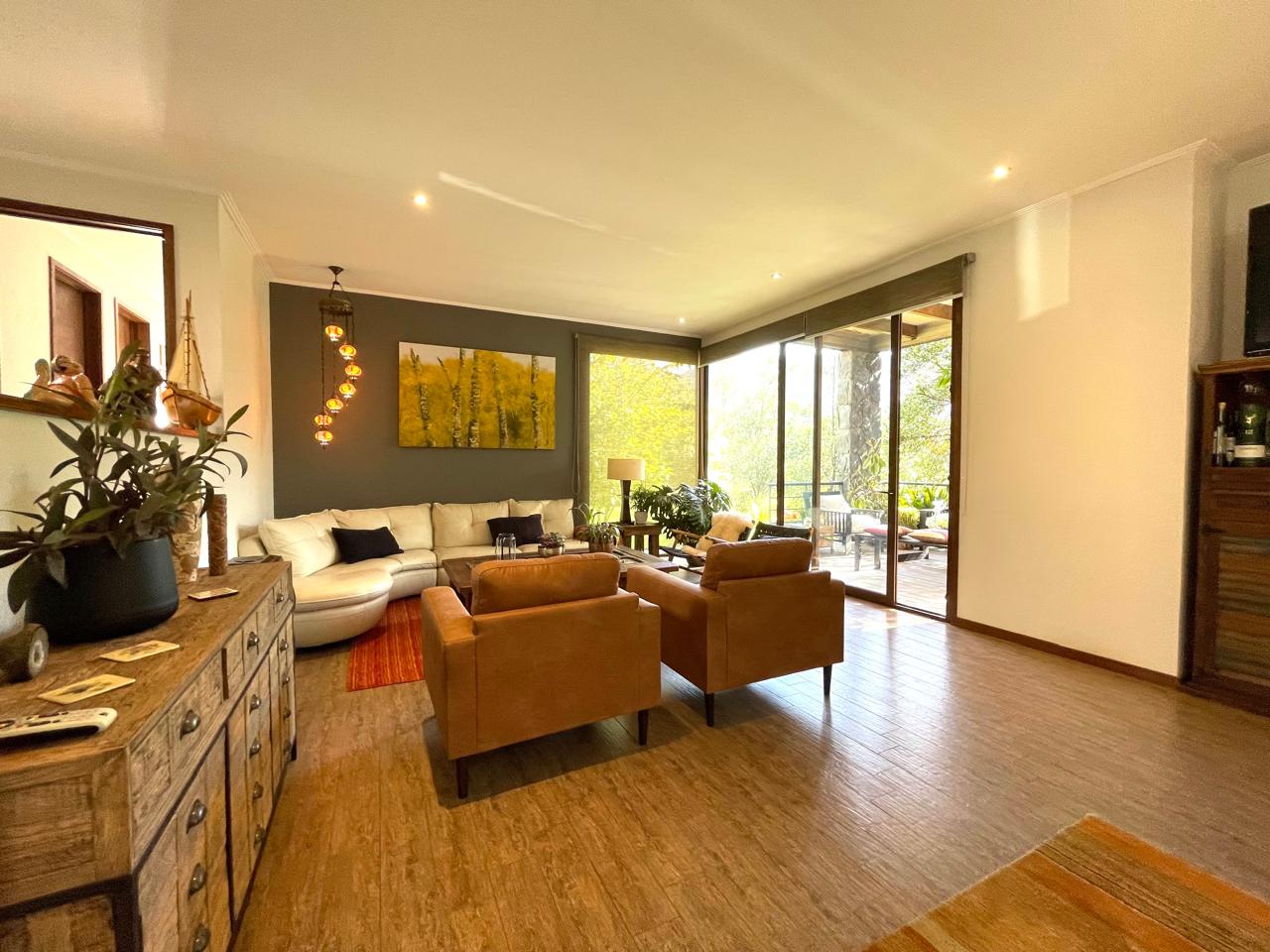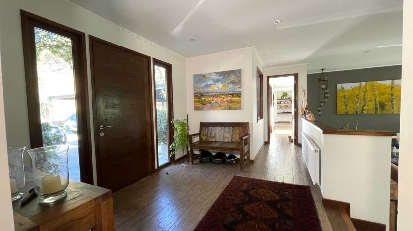 Esta Casa se encuentra ubicada en condominio con seguridad 24/7, en El Arrayán, con vista despejada a las montañas y la cordillera, rodeada de un entorno natural. Construida en 2017 bajo altos estándares de calidad, cuenta con pisos de porcelanato en toda la propiedad, ventanas de termopanel en PVC y calefacción central por radiadores. El primer nivel dispone de un hall de entrada amplio, baño de visitas, living y comedor integrados con salida a una terraza y al jardín, cocina semi integrada equipada con comedor de diario y despensa, además de una sala de lavado con acceso al patio de servicio. El dormitorio principal en suite incorpora sala de estar, dos walk-in closets y salida a terraza y jardín, con vistas a la naturaleza circundante. En el nivel superior se encuentra una sala de estar con vista y dos dormitorios que comparten un baño. El nivel inferior dispone de una sala de estar, dos dormitorios adicionales que comparten un baño y un dormitorio pequeño en suite que puede utilizarse como dormitorio de servicio o séptimo dormitorio. En el exterior, la propiedad cuenta con un jardín formado, piscina, amplias áreas verdes, bodega, estacionamiento techado para cuatro vehículos y espacio para estacionar hasta siete automóviles adicionales. El terreno tiene una superficie de 5,700 m² con una construcción de 357 m² distribuidos en dos niveles y 72.5 m² de terrazas. Los gastos comunes tienen un valor base de $280,000, a los que se suma el consumo de luz y agua según lo establecido por el condominio.