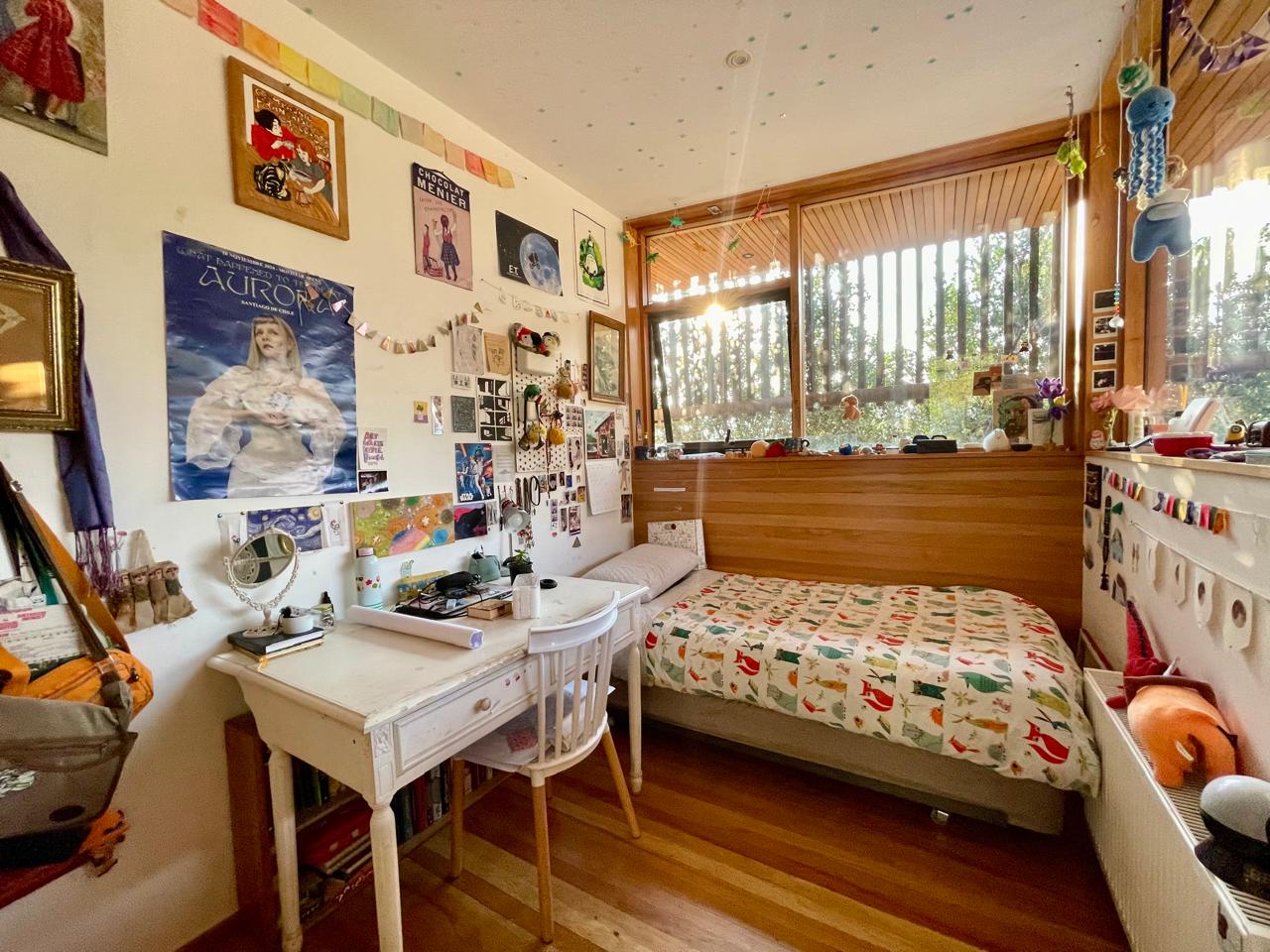 Todo el piso de madera de demolición, con dos escritorios para estudiar y librero.