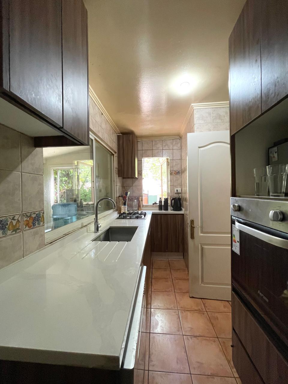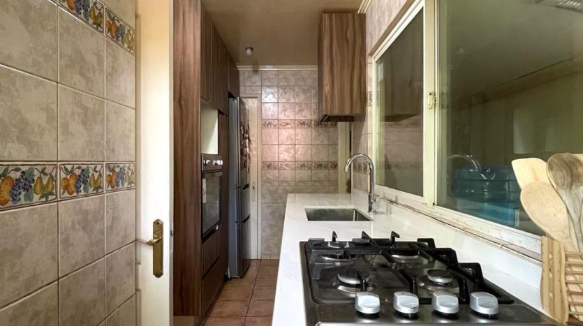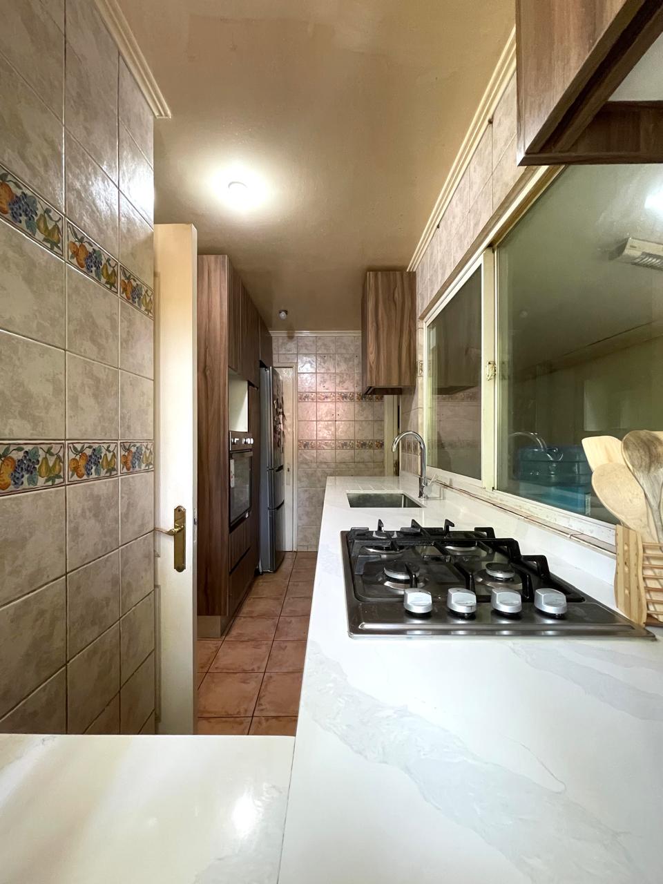 Baño de visita, cocina con cubierta de silestone, pieza de lavado con grandes closets para guardar, patio de servicio.