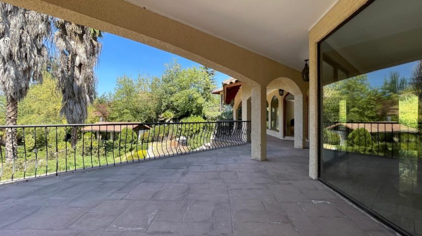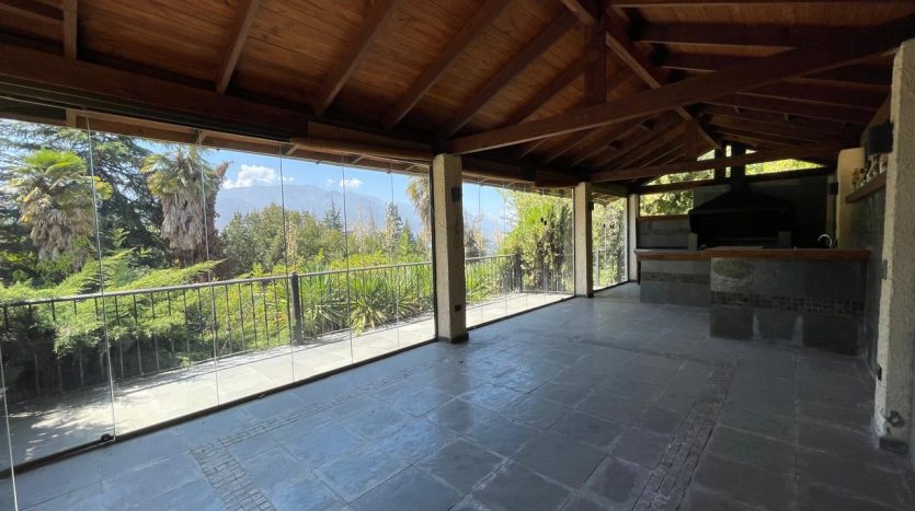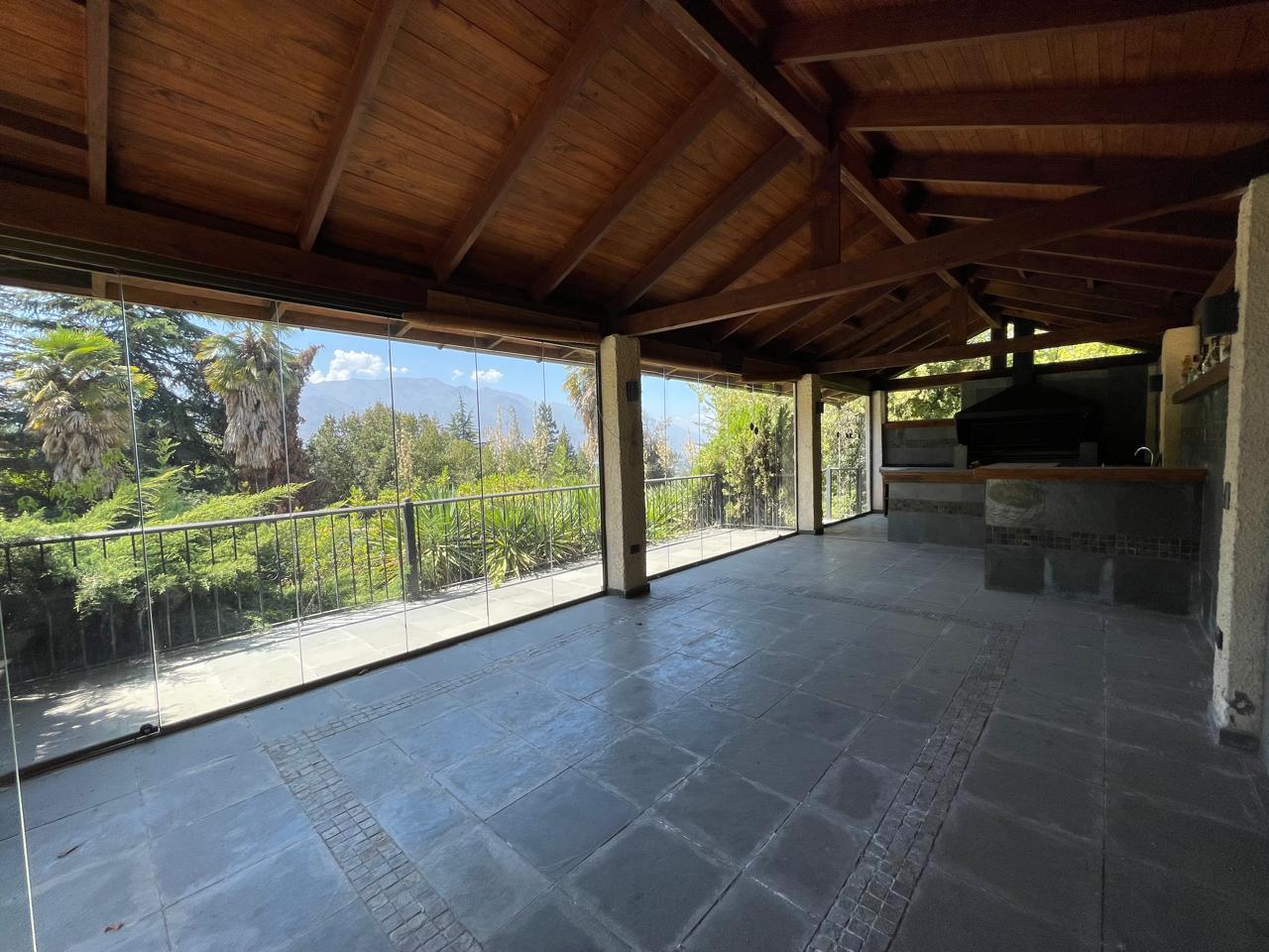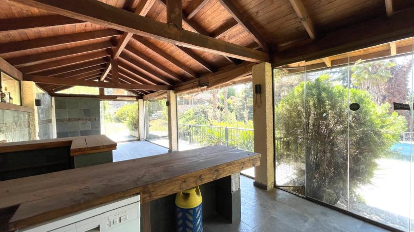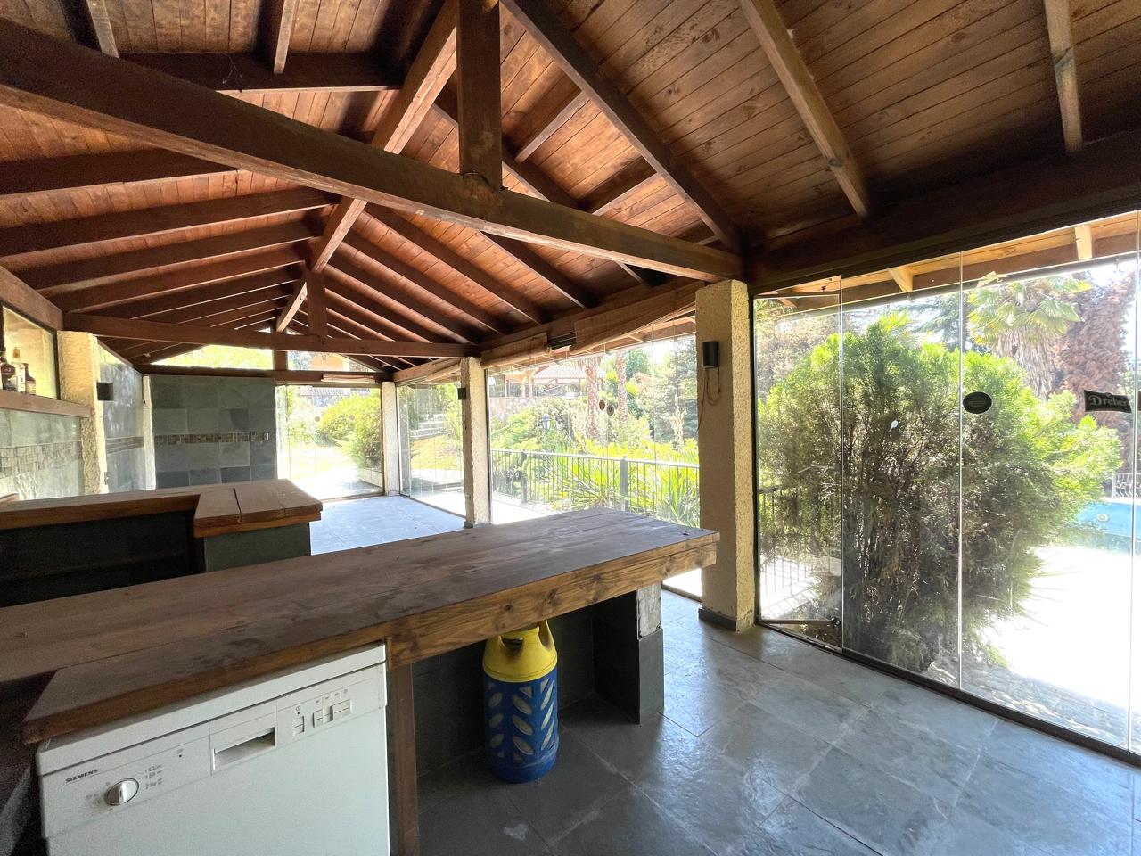Riego automático, ventanas termopanel, calefacción central por radiadores, gran quincho cerrado todo con madera y piedra pizarra, vidrios plegables con salida al jardín, gran piscina con bomba de calor, camarines, baño y bodega.