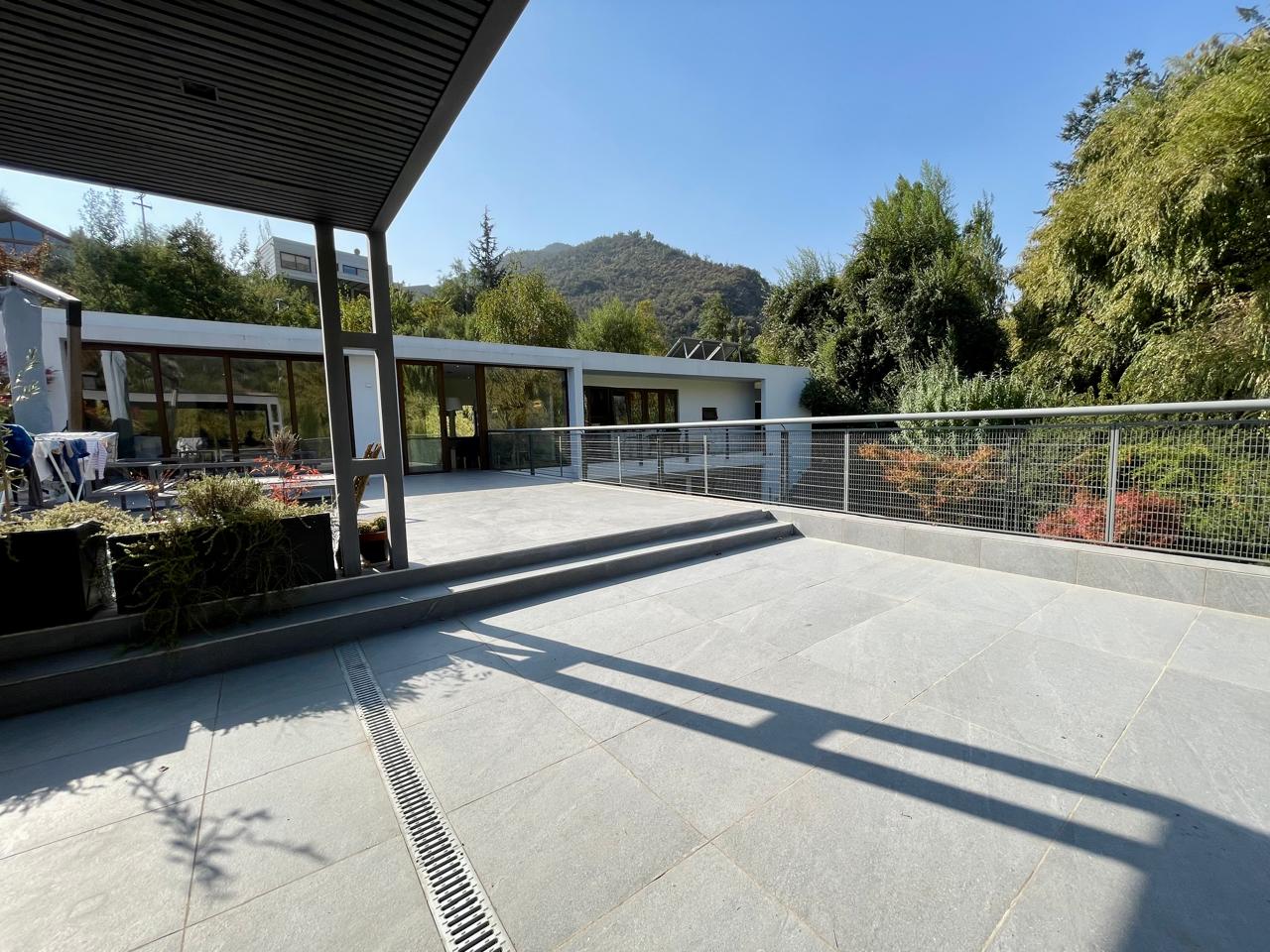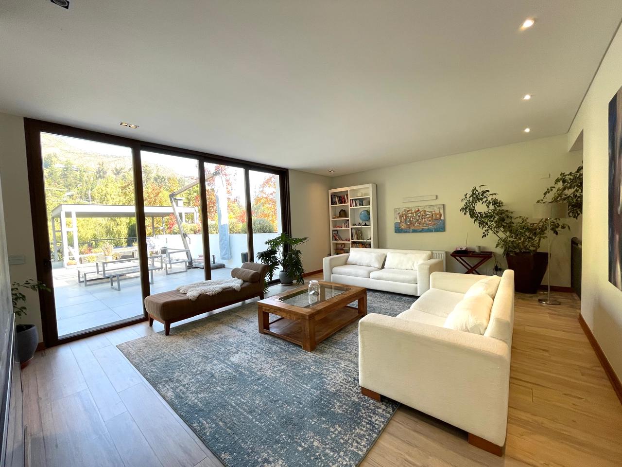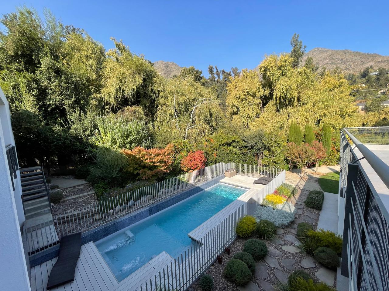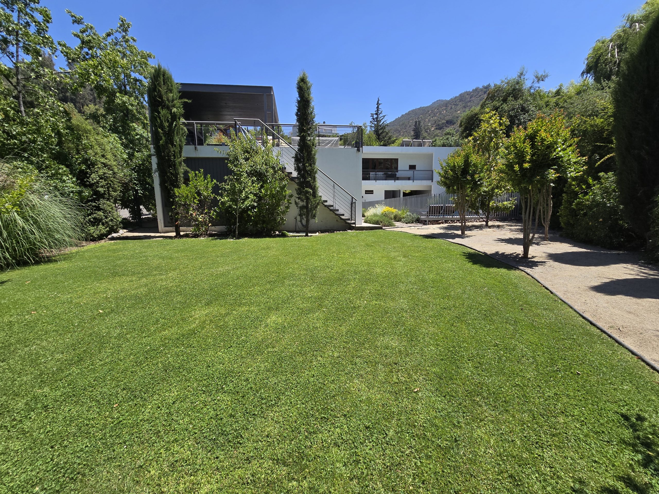 ACTUALMENTE ESTA ARRENDADA HASTA 2026 Condominio, Seguridad!! Estupenda!! Mediterránea y moderna casa en dos Niveles, muy iluminada, construida el año 2014, con eficiencia energética con sistema domótico, con maravilloso entorno natural, jardines, , con salida a senderos y bajada al río, juegos de niños, diseñada por el reconocido arquitecto Carlos Bidegain. Todas las Ventanas termopanel ,marcos PVC, con vidrios con láminas protectoras( blindadas) , iluminación controlada por sistema domótica, piscina con sistema de cloración salina , con jacuzzi, temperada con sistema de serpentín solar, camarín con baño, bodega Calefacción con caldera a pellet y gas, ambos sistemas son independientes, pisos de porcelanato y finos pisos de madera, generador ( por si hay cortes de luz), moderno circuito eléctrico, sistema de cámaras, riego automático y por goteo, maravilloso jardín y entorno , canil y gallinero, huerta. Gran estacionamiento techado. 1er Nivel: Amplio hall, living comedor separados, living con salida a gran terraza con vista panorámica de aprox. 120 m2, Gran Quincho. Baño de visita Cocina amplia con cubierta cuarzo blanco con salida a un balcón, comedor de diario, pieza de lavado, pieza de servicio con baño, patio de servicio techado. Nivel inferior. Gran sala de estar con salida al jardín, 1 dormitorio en suite con salida a la terraza y jardín, 3 dormitorios amplios con salida a la terraza y jardín, 2 baños, gran dormitorio principal en suite con walking closet con salida al jardín y terraza A pocos minutos del International Preparatory School y del Maimonides (Jewish Education for New Generation),Nido de Aguilas, cercana también a autopista Costanera Norte y Avenida Las Condes, de la plaza San Enrique, Mall Sport, Supermercados, y Colegios. . Gastos comunes aprox. $260,000. CMM1604251