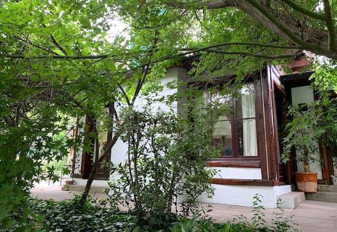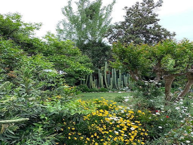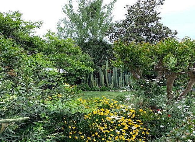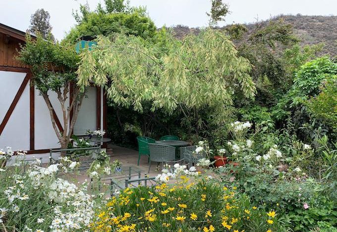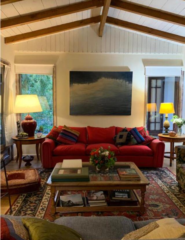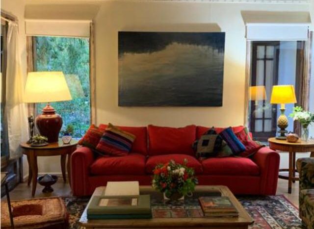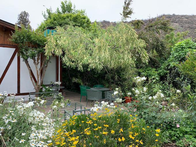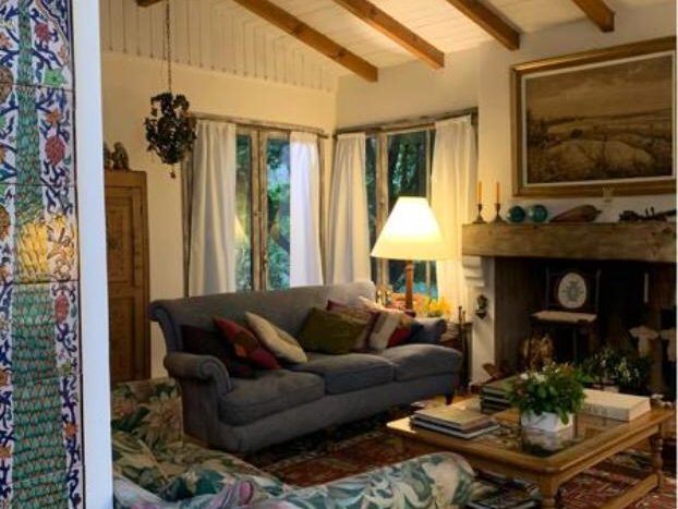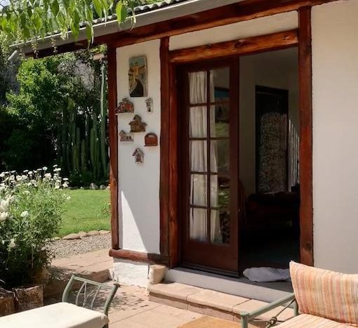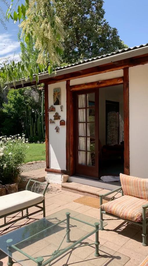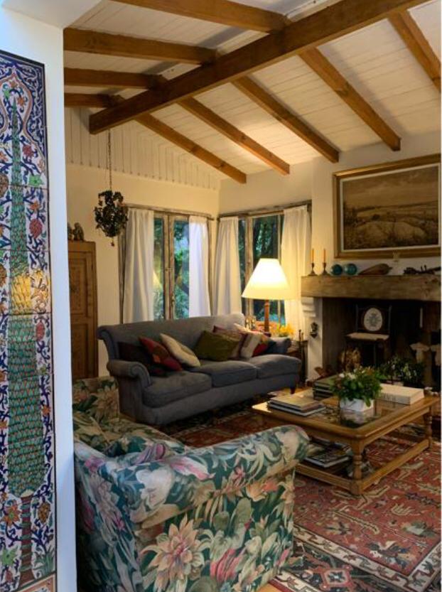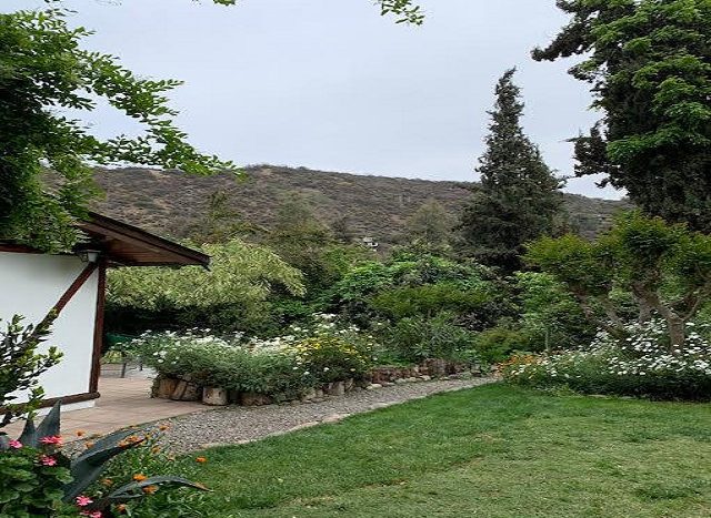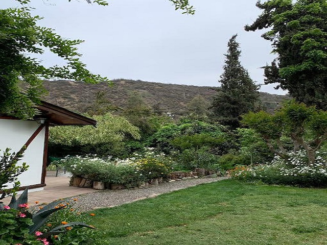 rodeada de precioso jardín con sectores planos y lomitas, muy verde, lleno de flores y árboles preciosos, lindas vistas hacia Cordillera y Cerros