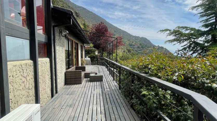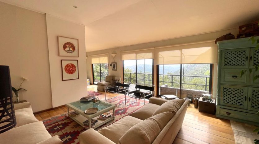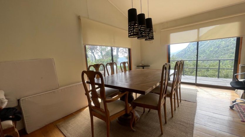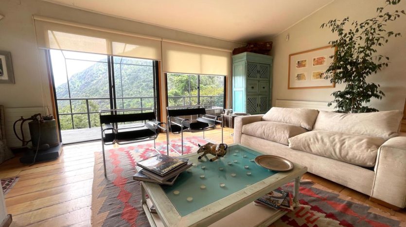 Gran Living y comedor separado, ambos con salida a una terraza con deck de madera, con vista al norte y hacia el valle