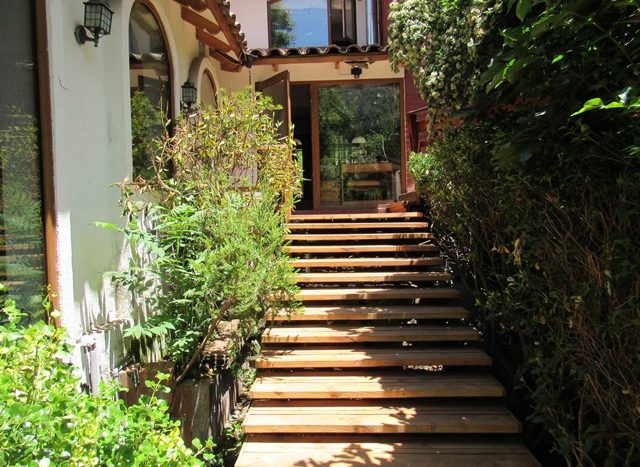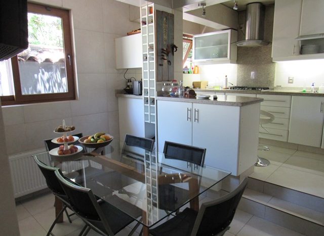 Primer piso: gran hall de entrada con salida al jardín, baño de visita, cocina con comedor de diario, muebles con cubierta de granito, patio de servicio, pieza de servicio con baño, lavadero, bodegas, living comedor separados en desnivel con salida a la terraza ( deck de madera), dormitorio principal en suite con salida a la terraza, ( deck de madera).
